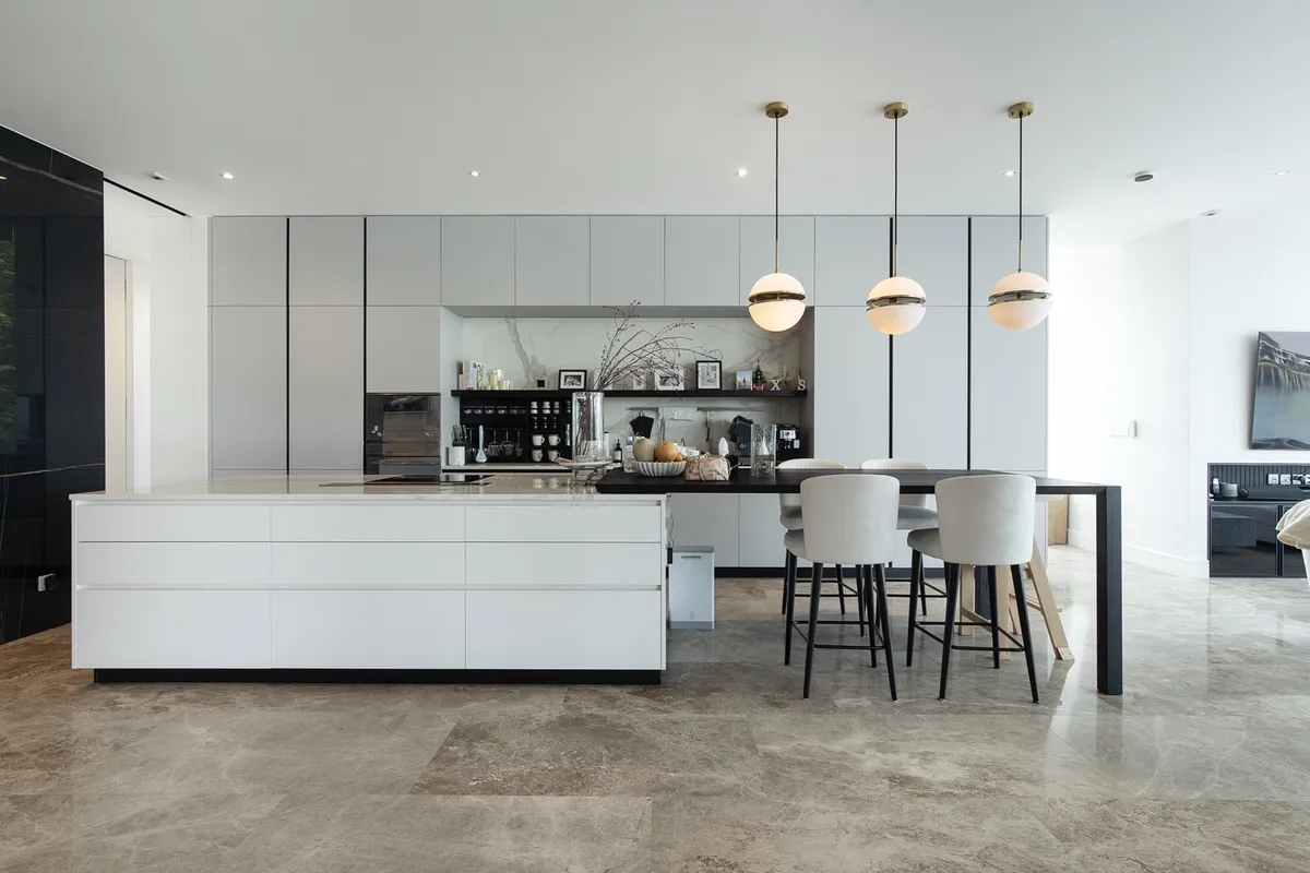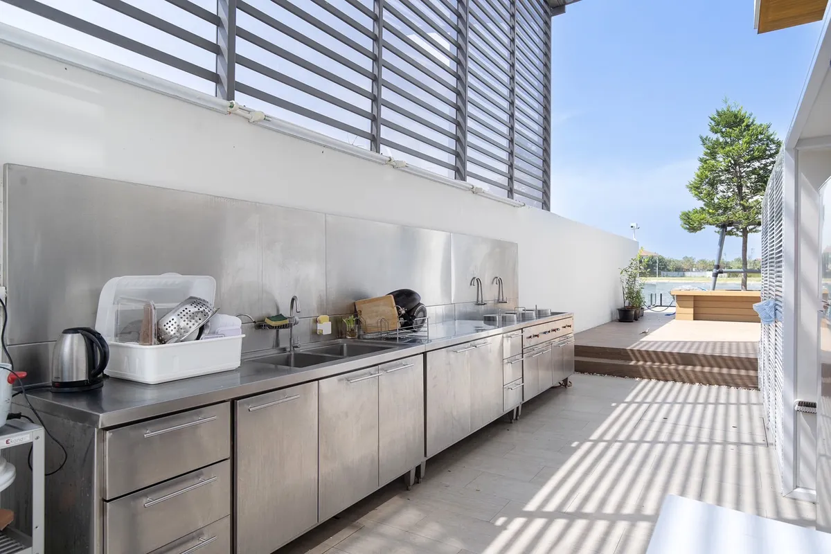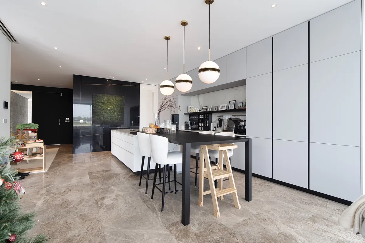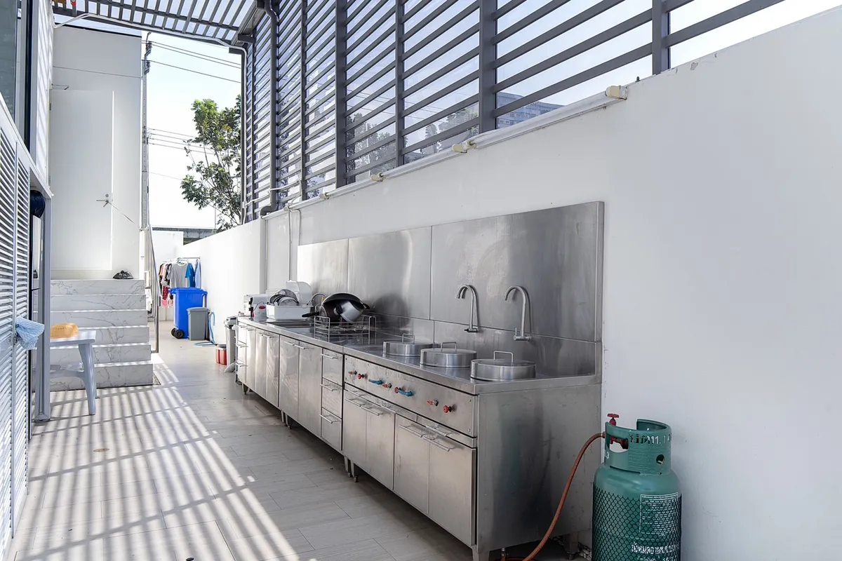 ครัวฝรั่งพร้อมไอส์แลนด์และเครื่องดูดควัน และครัวไทยที่แยกต่างหาก ตู้เก็บไวน์หลายตู้